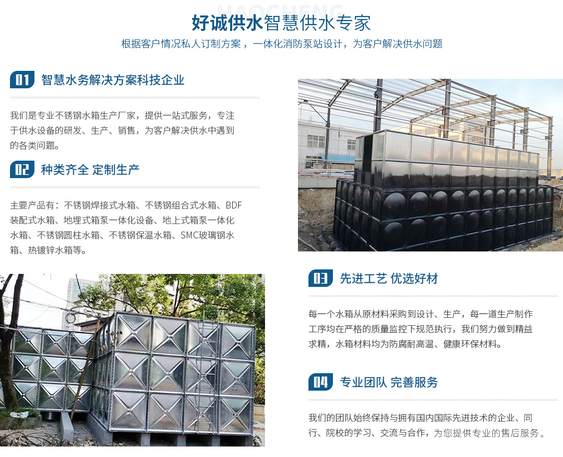 安徽好誠供水設備制造有限公司是一家集設計、研發、制造、銷售、售后為一體的專業不銹鋼水箱生產廠家,以科技力量立足于社會。近幾年來致力于供水設備、水箱的研究與開發。主要產品有:不銹鋼焊接式水箱、不銹鋼組合式水箱、BDF裝配式水箱、地埋式箱泵一體化設備、地上式箱泵一體化水箱、不銹鋼圓柱水箱、不銹鋼保溫水箱、SMC玻璃鋼水箱、熱鍍鋅水箱。對于傳統混凝土水箱的改造(即不銹鋼內貼水箱),老舊水箱的拆除、更換、...